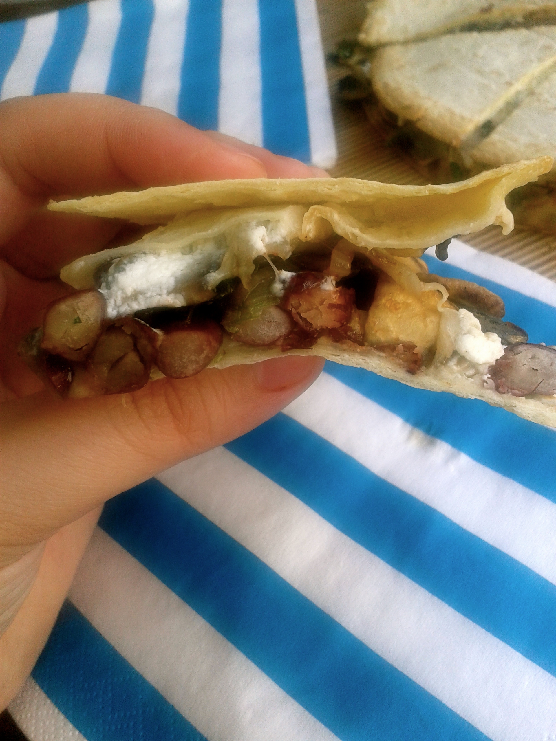 Dann müssen die Tortillas für ca. 5-10 Minuten in den Ofen (200 Grad) bzw. bis sie heiß genug sind und der Käse geschmolzen ist. Während sie im Ofen sind, das Gemüse anbraten und mit Salz und Pfeffer gewürzt. Wenn Fleischprodukte verwendet werden, sollten vielleicht etwas mehr Zeit für das Erhitzen der Zutaten geplant werden. Nachdem der Käse geschmolzen ist, müssen Sie nur noch die Tortillas herausnehmen, das Gemüse hinzufügen…..