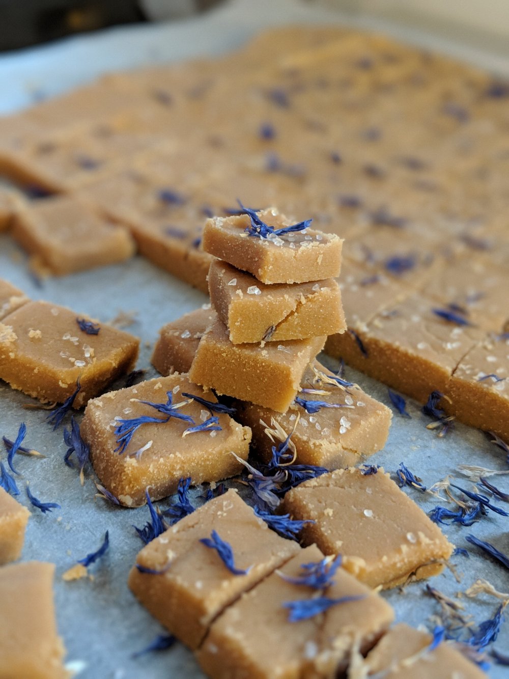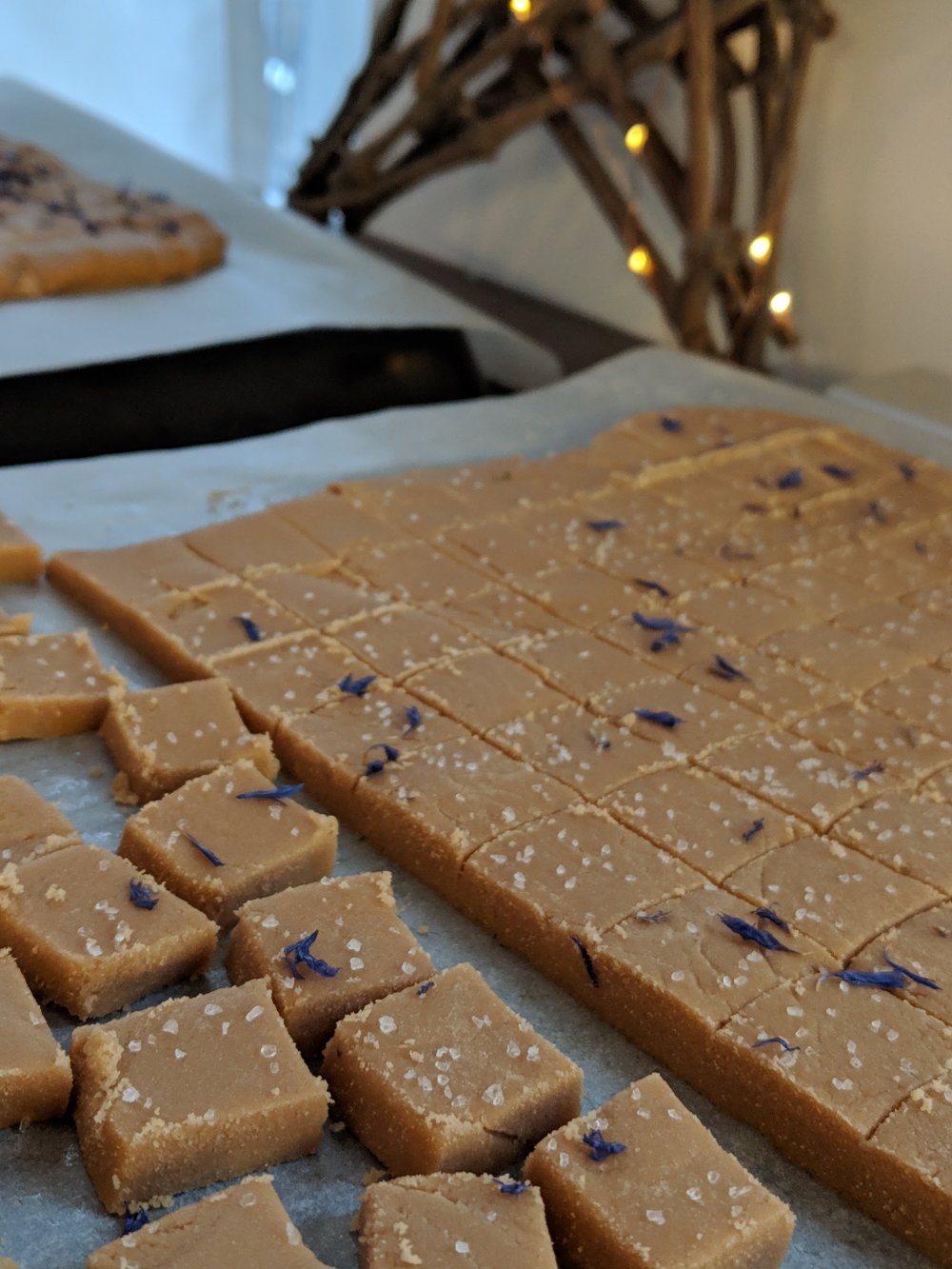 Mit grobem Salz und Blüten dekorieren und einige Minuten abkühlen lassen. Noch warm in kleine Würfel schneiden (die Masse sollte so kühl sein, dass das Messer nicht kleben bleibt).