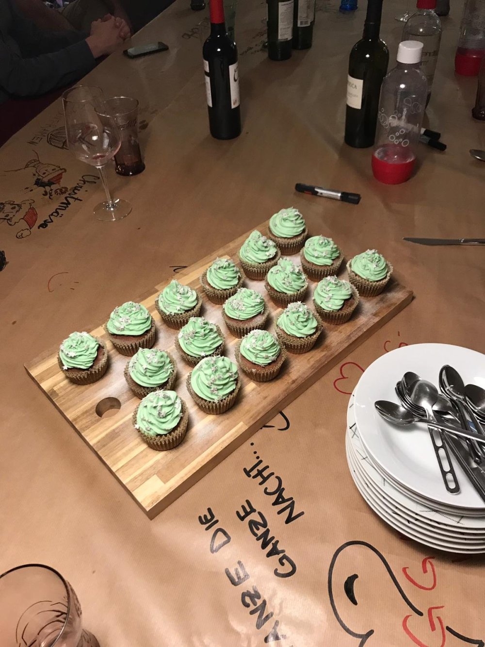 Füge grüne Lebensmittelfarbe hinzu – wenn du eine Paste verwendest, wird die Farbe etwas intensiver, ich habe hier flüssige Lebensmittelfarbe verwendet. Falls die zugegebene Flüssigkeit die Konsistenz zu sehr ändert, können weitere 2-3 Esslöffel Puderzucker hinzugefügt werden. Die Mischung in einen Spritzbeutel füllen und von aussen nach innen kreisförmig auf die kühlen Cupcakes spritzen.