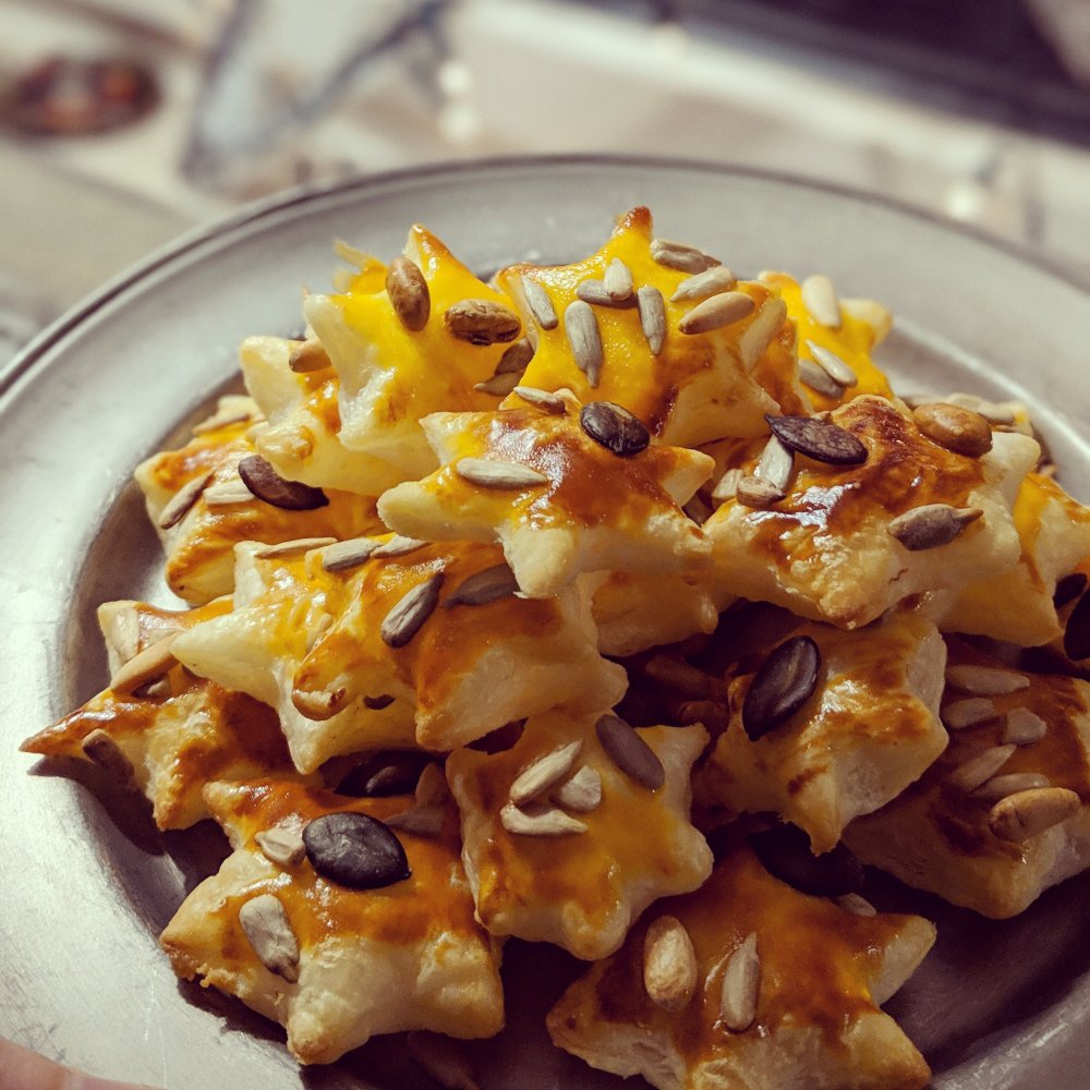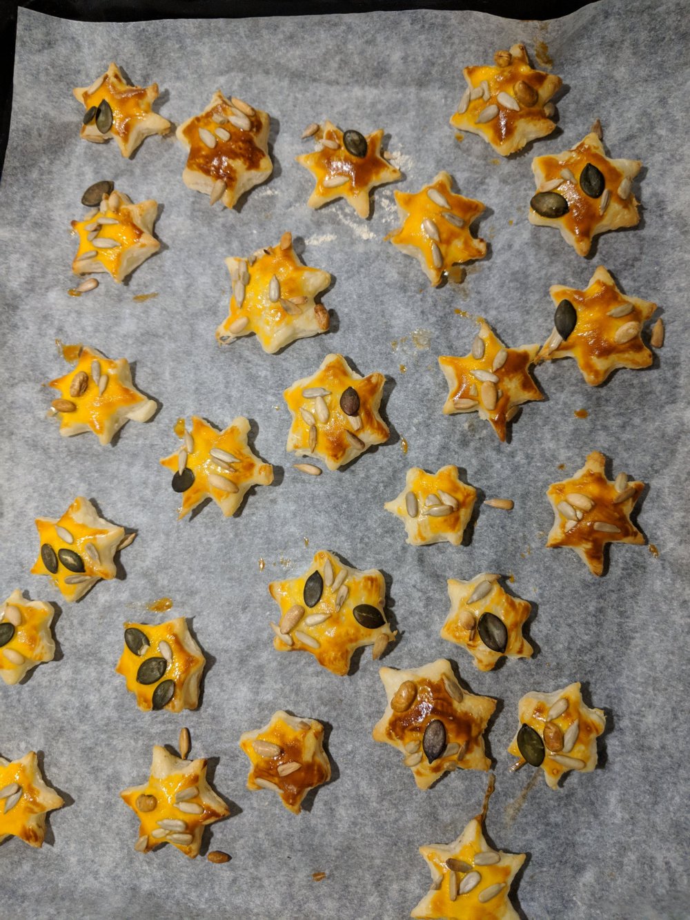 Die Sterne (oder jede andere Form, die Sie möchten) aus dem Blätterteig ausstechen. Die Sterne mit Eigelb bestreichen und mit Kürbis/Mixkernen bestreuen. Im Backofen 15-20 Minuten (200 Grad) backen. Anrichten und geniessen!