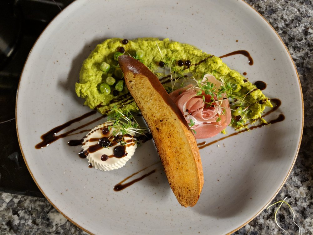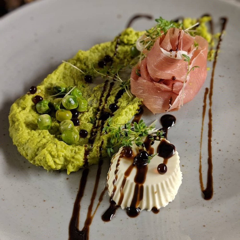 Dieses kleine Gericht war der Auftakt zu unserem hausgemachten 5-Gang-Weihnachtsmenü für zwei Personen: ein Ziegenkäse-Panna-Cotta kombiniert mit einem Erbsenpüree, dazu frische Erbsen, Balsamico-Perlen und eine Prosciutto-Rose. Ich habe dazu eine Scheibe geröstetes Brot serviert, um etwas Biss hinzuzufügen. Diese Vorspeise wird lauwarm serviert, mit einem lauwarmen Püree und einer kalten Ziegenkäse-Panna-Cotta.