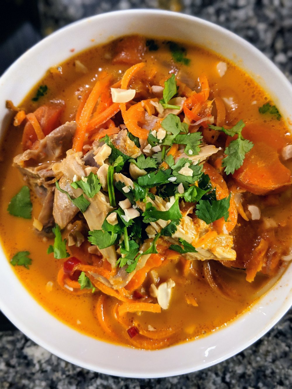 Hier geht es zu einem weiteren meiner Lieblingsrezepte mit einem umweltbewussten Suppenhuhn-Twist. Dieses thailändisch inspirierte Gericht ist auch eines meiner Lieblingsrezepte, wenn ich ein gesundes, kohlenhydratarmes Abendessen mit sehr wenig Kalorien möchte: Dieses Mal gabs Karotten Nudeln (Zoodles) und Shirataki-Nudeln anstelle von klassischen Nudeln. Shirataki Nudeln sind Konjak Yam-basiert und super leicht in Kalorien (ca. 16 kcal / 100g!) und Kohlenhydraten, so dass sie verwendet werden können, um eine Vielzahl von Nudeln zu ersetzen, wenn eine leichtere Mahlzeit erwünscht ist.