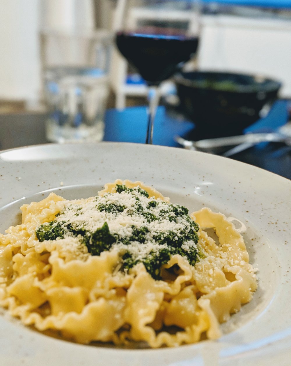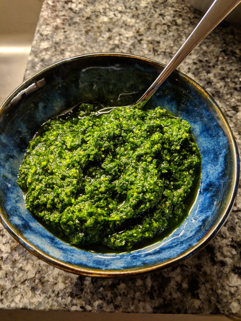 Den Bärlauch fein hacken – oder mit dem Olivenöl in eine Küchenmaschine geben und pulsieren, bis die gewünschte Konsistenz erreicht ist. Bärlauch, Öl, Parmesan und gemahlene Pinienkerne mischen, mit Salz würzen – und genießen!